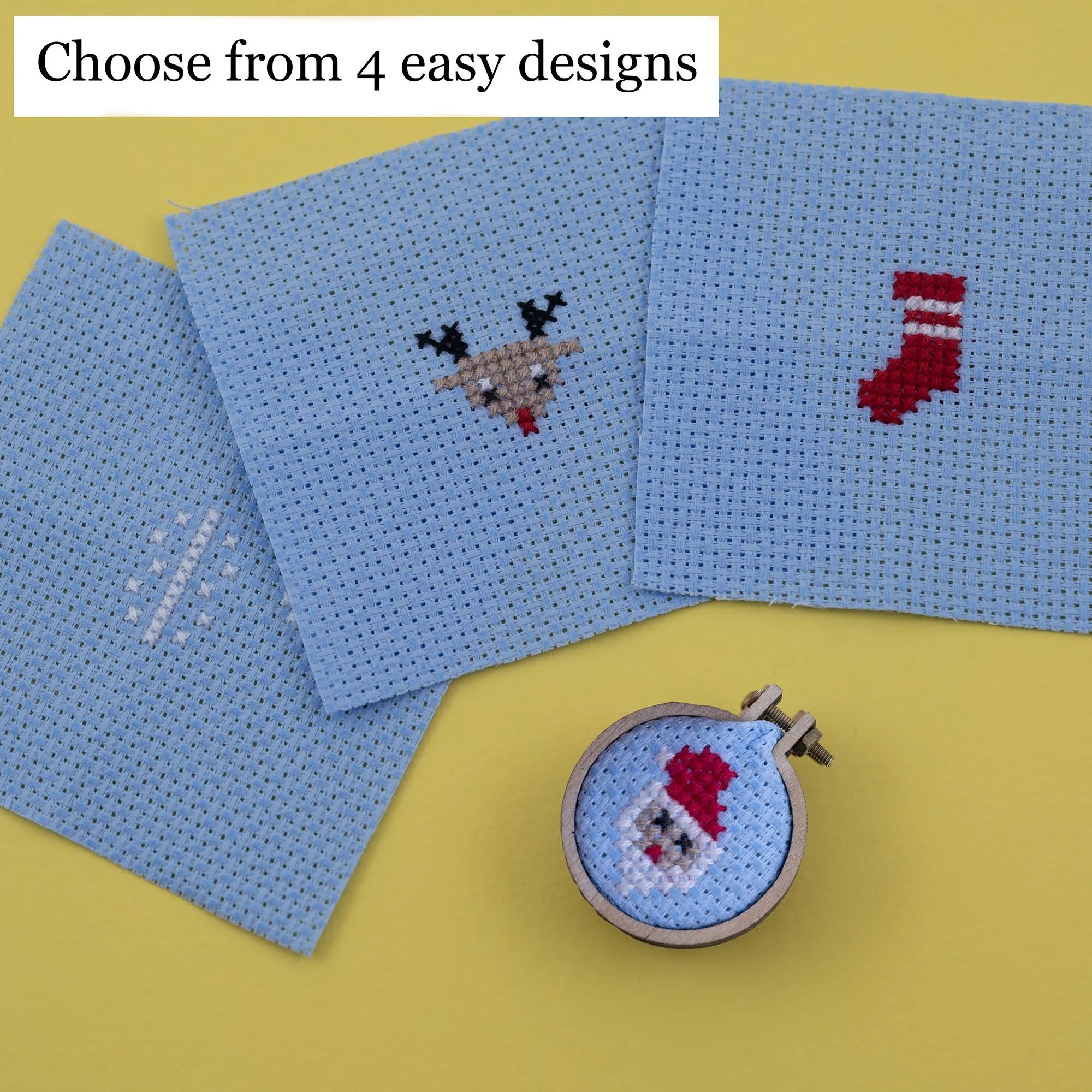 This mini cross stitch kit is sure to delight for beginners or experts alike, with aida, needle, threads and even a mini wooden hoop plus full instructions for Christmas designs.