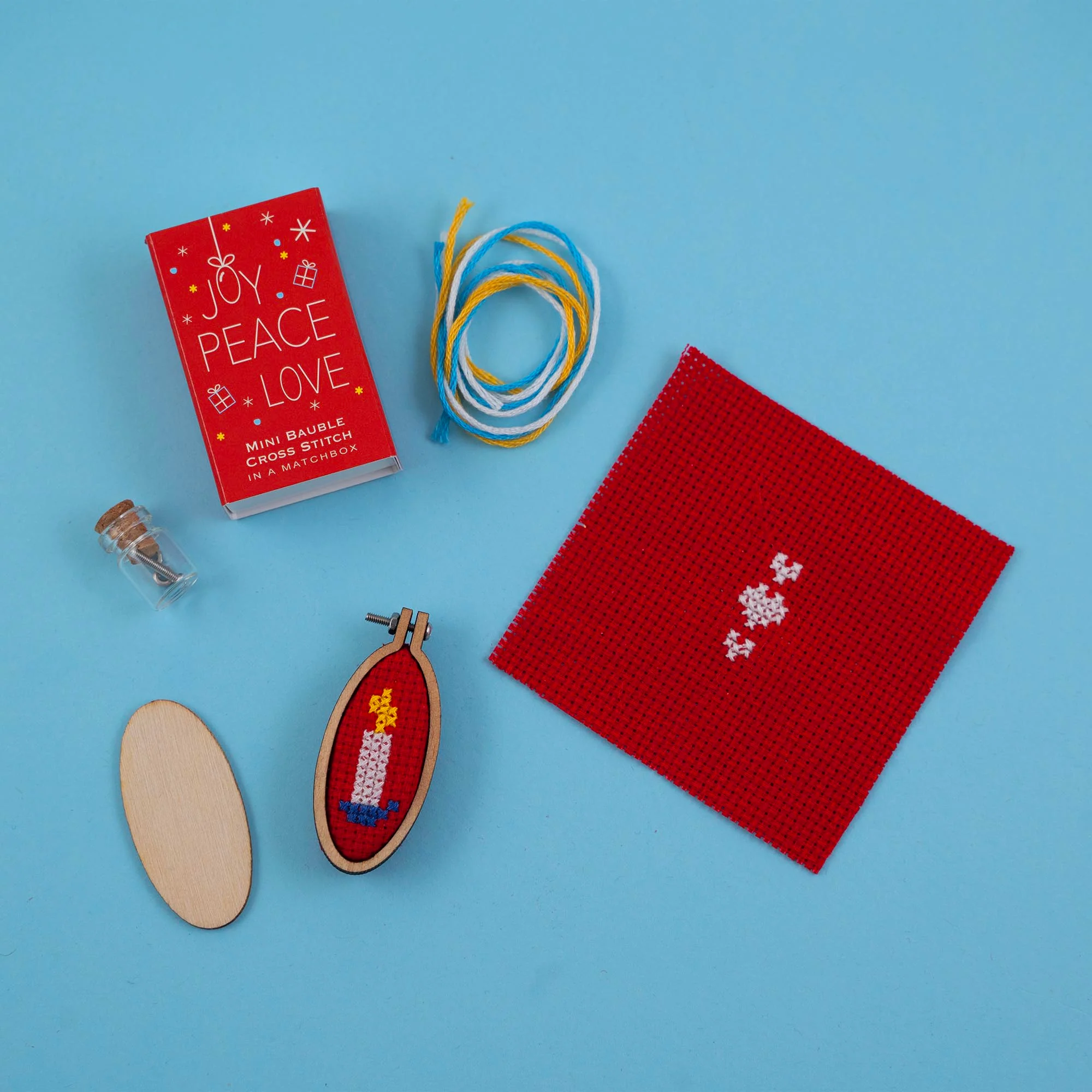 Mini cross stitch kit to make a Christmas bauble with four festive designs packed in a tiny matchbox.