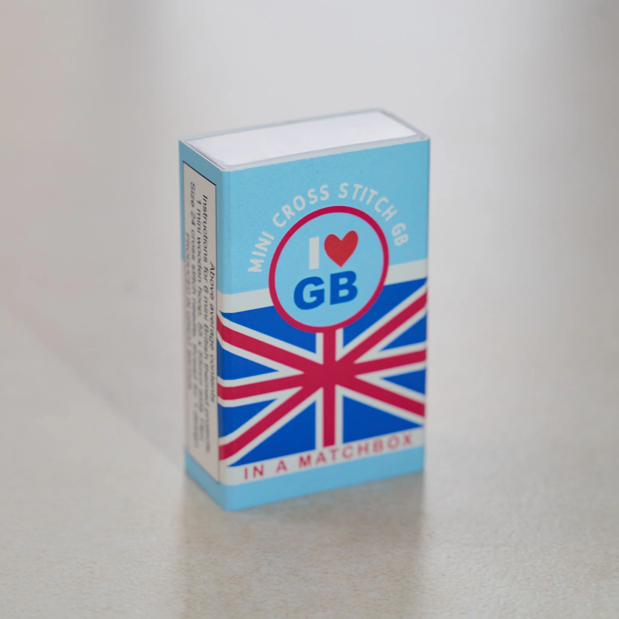 A complete cross stitch kit with everything you need to make a British themed design all packed into a tiny matchbox.