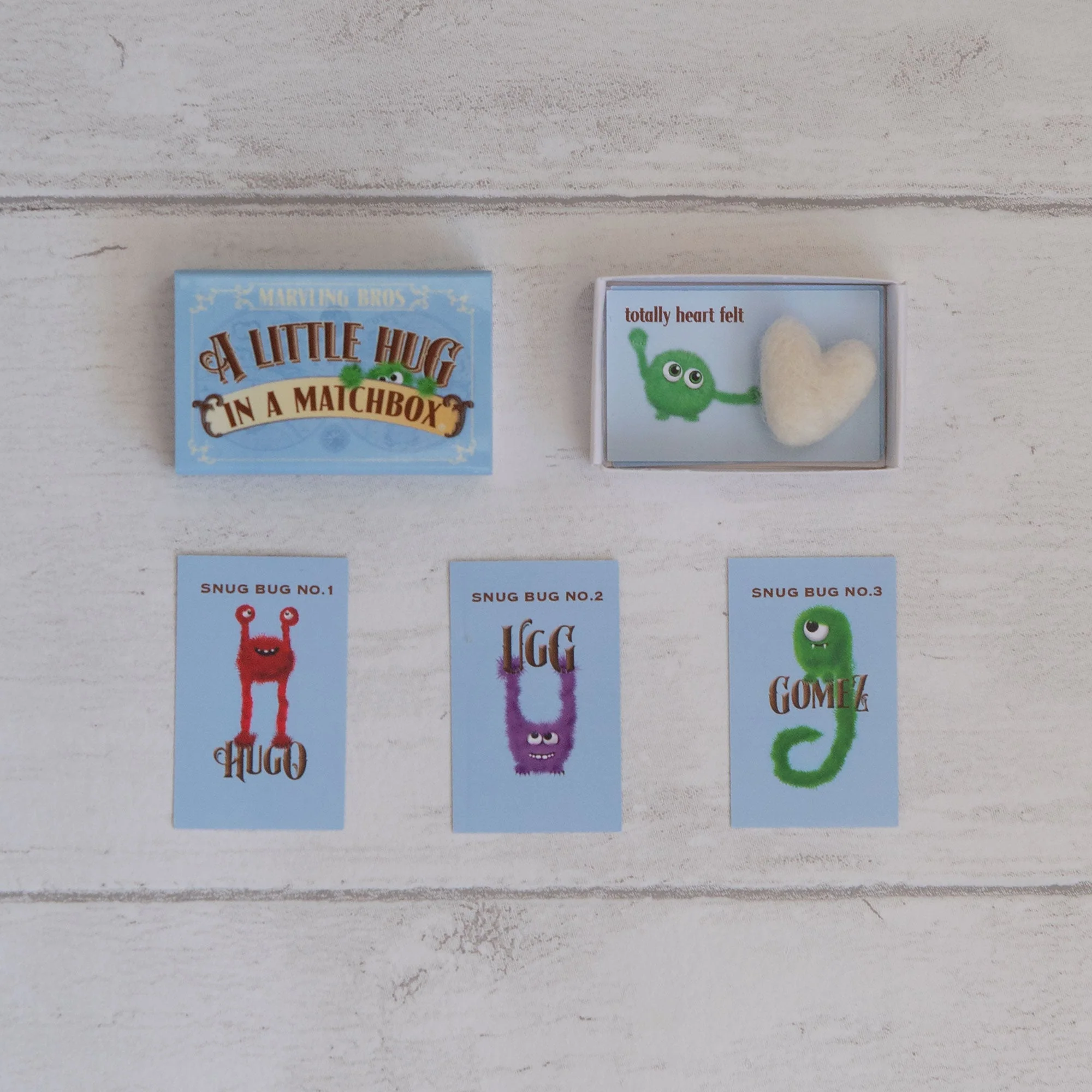 The matchbox contains a 2cm handmade felt heart on a 'totally heart felt' message card and three cards with full instructions on how to give a good hug (including bear hug, man hug, group hug and basic cuddles and snuggles)