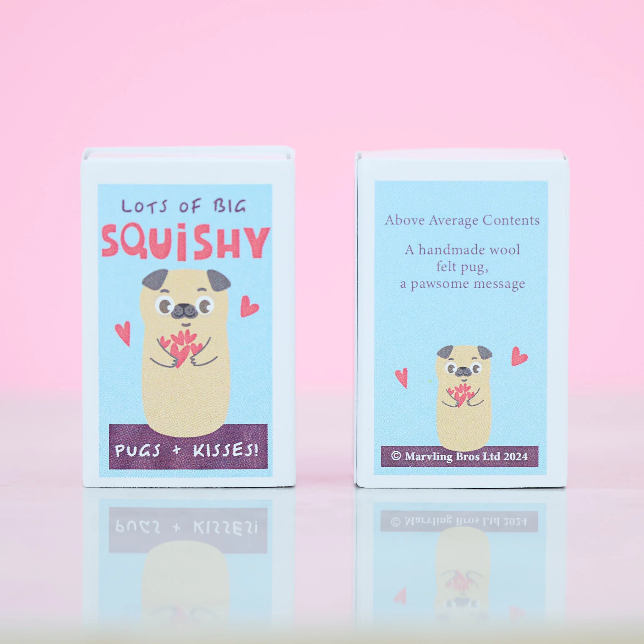 On the outside, the matchbox features a cute picture of a pug and the heartwarming message: "Lots Of Big Squishy Pugs And Kisses." Inside, is the most endearing wool felt pug along with the touching note: "Fur-ever friends!"