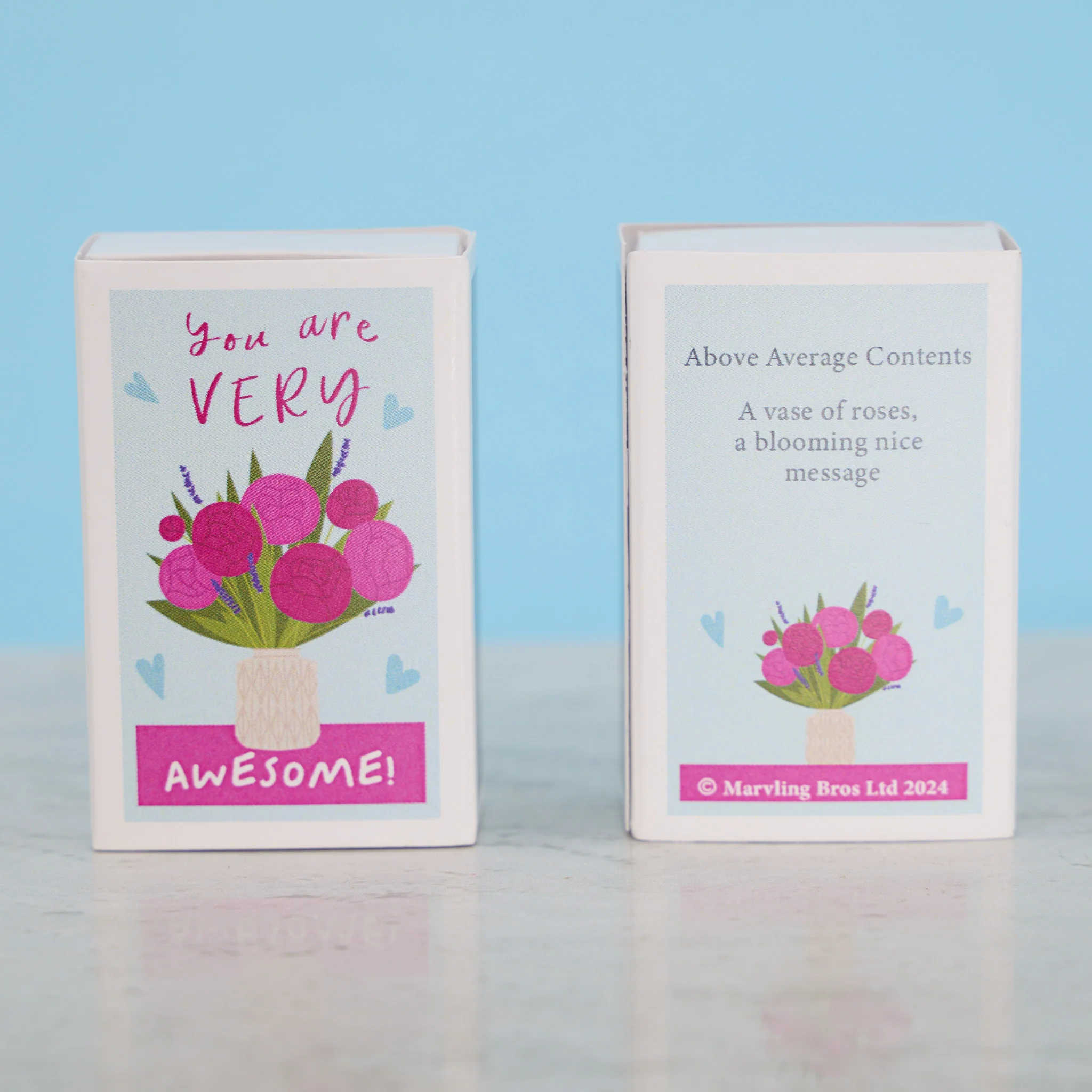 You Are Very Awesome vase of flowers in a matchbox: petals, paper, and pure joy!